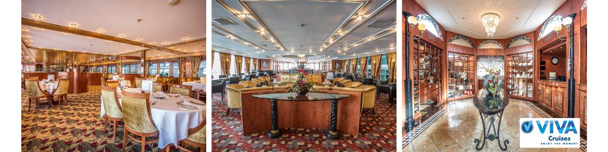 De stijlvolle lounge aan boord van de MS VIVA Voyage is de ideale plek om even helemaal tot rust te komen. Deze ruimte is ingericht met comfortabele zitplaatsen en een modern design, wat zorgt voor een ontspannen sfeer. Hier kun je nieuwe mensen ontmoeten, een boek lezen of genieten van een goed gesprek onder het genot van een kopje koffie of een cocktail.